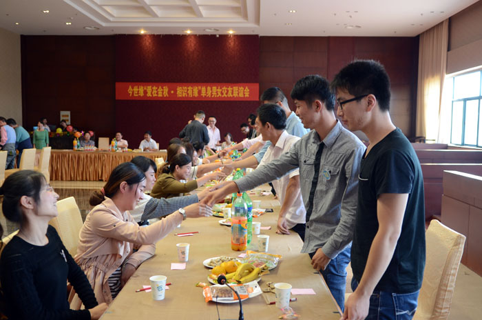 在溫馨浪漫的國緣賓館多功能廳,聯(lián)誼活動(dòng)在主持人楊曉珊、徐云龍的煸情鼓動(dòng)下,小伙子熱情似火,姑娘們落落大方,氣氛一浪高過一浪?!秱髌妗?、《你是我的眼》等男女獻(xiàn)歌,向心儀的她和他傳遞著真情愛意。個(gè)人才藝展示,為帥哥美女們提供了“放電”的舞臺(tái)?!赌銇肀葎澪襾聿隆?、《擠氣球》、《兔子舞》、《過橋》等互動(dòng)游戲,讓一對(duì)對(duì)有緣男女通過短暫的交流、默契的配合、心靈的碰撞,達(dá)到加深了解、增進(jìn)友誼?,F(xiàn)場10對(duì)男女青年的成功牽手,使聯(lián)誼會(huì)上演為精彩的一幕。