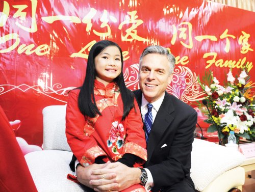 洪博培夫婦育有5個(gè)孩子,對中國文化的熱愛,他們萌發(fā)了收養(yǎng)一個(gè)中國女孩的愿望。1999年12月15日,洪博培夫婦從中國揚(yáng)州福利院收養(yǎng)了出生不久的楊樂意。在猶他州,許多人也都通過楊樂意了解中國。10年后,洪博培利用任駐華大使的機(jī)會,攜女兒回?fù)P州尋根,受到熱烈歡迎。從中國女兒的眼睛里,洪博培看到了和諧、快樂和美麗的中國,希望她長大后能為促進(jìn)中美關(guān)系健康發(fā)展做貢獻(xiàn)。