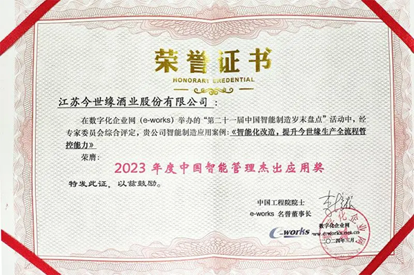 近年來(lái),今世緣在白酒生產(chǎn)科技研發(fā)及裝備方面始終處于行業(yè)領(lǐng)先地位。早在2005年,今世緣就開(kāi)始自動(dòng)化釀酒生產(chǎn)線的研發(fā),并在白酒調(diào)配、庫(kù)存管理等方面啟動(dòng)自動(dòng)化和信息化升級(jí)。2015年,中國(guó)首套裝甑機(jī)器人生產(chǎn)線在今世緣投產(chǎn)。2016年,中國(guó)酒業(yè)協(xié)會(huì)授予今世緣“中國(guó)白酒智能化釀酒示范車間”稱號(hào)。今年,在第二十一屆中國(guó)智能制造歲末盤點(diǎn)頒獎(jiǎng)典禮在上,今世緣酒業(yè)智能制造應(yīng)用案例《智能化改造,提升今世緣生產(chǎn)全流程管控能力》榮獲“2023年度中國(guó)智能管理杰出應(yīng)用獎(jiǎng)”。