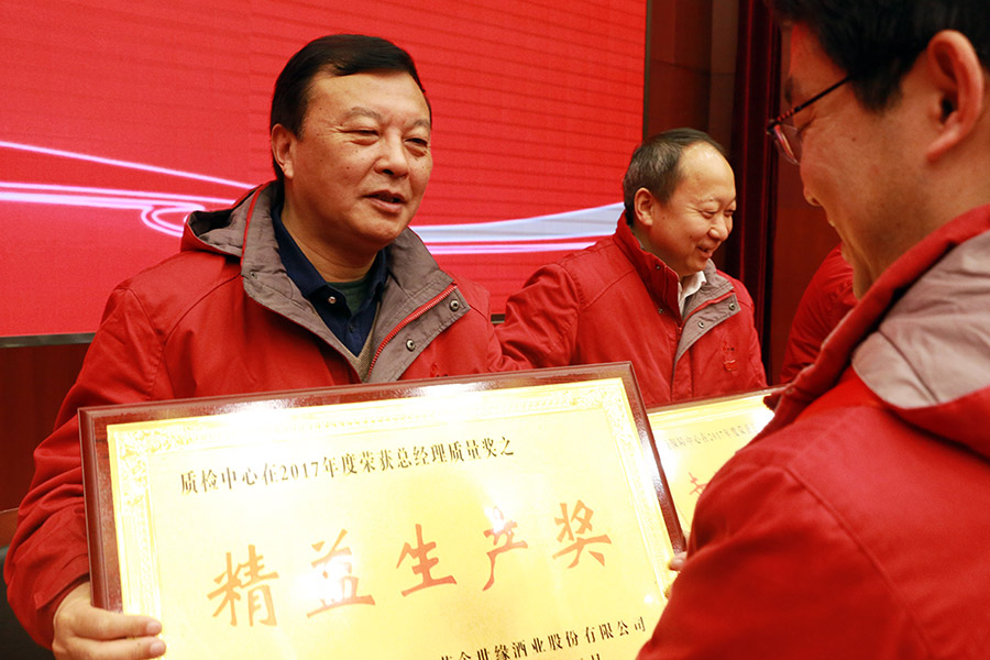 吳建峰宣讀了公司《關(guān)于表彰2017年度先進(jìn)集體和先進(jìn)個(gè)人的決定》。南京營(yíng)銷中心等6個(gè)部門和單位榮獲“總經(jīng)理質(zhì)量獎(jiǎng)——營(yíng)銷團(tuán)隊(duì)獎(jiǎng)”;釀酒中心十車間等6個(gè)部門和單位榮獲“總經(jīng)理質(zhì)量獎(jiǎng)——精益生產(chǎn)獎(jiǎng)”;后勤保障中心等4個(gè)部門和單位榮獲“總經(jīng)理質(zhì)量獎(jiǎng)——幸福今世緣獎(jiǎng)”;淮安營(yíng)銷中心經(jīng)理余濤等10名同志榮獲“杰出質(zhì)量人——銷售之星”榮譽(yù)稱號(hào);管理信息部常務(wù)副經(jīng)理兼績(jī)效辦經(jīng)理王愛(ài)紅等10名同志榮獲“杰出質(zhì)量人——管理之星”榮譽(yù)稱號(hào);動(dòng)力車間司爐工徐學(xué)華等10名同志榮獲“杰出質(zhì)量人——?jiǎng)趧?dòng)之星”榮譽(yù)稱號(hào);釀酒中心帶班主任吳利民等5名同志榮獲“杰出質(zhì)量人——?jiǎng)?chuàng)新之星”榮譽(yù)稱號(hào);管理信息部績(jī)效辦標(biāo)準(zhǔn)化管理員朱建鵬等5名同志榮獲“優(yōu)秀質(zhì)量人——學(xué)習(xí)之星”榮譽(yù)稱號(hào);釀酒中心帶班副主任曹衛(wèi)衛(wèi)等10名同志榮獲“優(yōu)秀質(zhì)量人——希望之星”榮譽(yù)稱號(hào);勾儲(chǔ)中心主任助理徐娟娟等5名同志榮獲“優(yōu)秀質(zhì)量人——巾幗之星”榮譽(yù)稱號(hào);設(shè)備和安全部安全員繆善念等5名同志榮獲“優(yōu)秀質(zhì)量人——報(bào)道之星”榮譽(yù)稱號(hào)。會(huì)上,南京營(yíng)銷中心經(jīng)理陳玖權(quán)、江西營(yíng)銷中心經(jīng)理曹飛虎、釀酒中心一車間帶班主任吳利民、包裝中心主任助理苗鍵先后發(fā)言,表示將立足本職工作,深入學(xué)習(xí)貫徹落實(shí)董事長(zhǎng)講話精神,完成2018年各項(xiàng)工作任務(wù)。