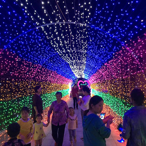 本次燈光節(jié)為期16天,通過萬盞彩燈的表現(xiàn)手法,向游客展示夢幻時光隧道、七彩變換水母燈、愛心拱門、帆船、連體LOVE、小豬佩奇、富士山、中國夢、海豚、梅花鹿等20余組大型燈光造型,盡展燈海奇觀給人帶來新穎、靚麗的視覺沖擊。
