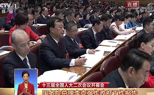 3月5日上午,第十三屆全國(guó)人民代表大會(huì)第二次會(huì)議在北京人民大會(huì)堂開(kāi)幕。圖為央視直播全國(guó)人大代表,公司董事長(zhǎng)周素明與代表們一起聆聽(tīng)李克強(qiáng)總理作政府工作報(bào)告的畫面。