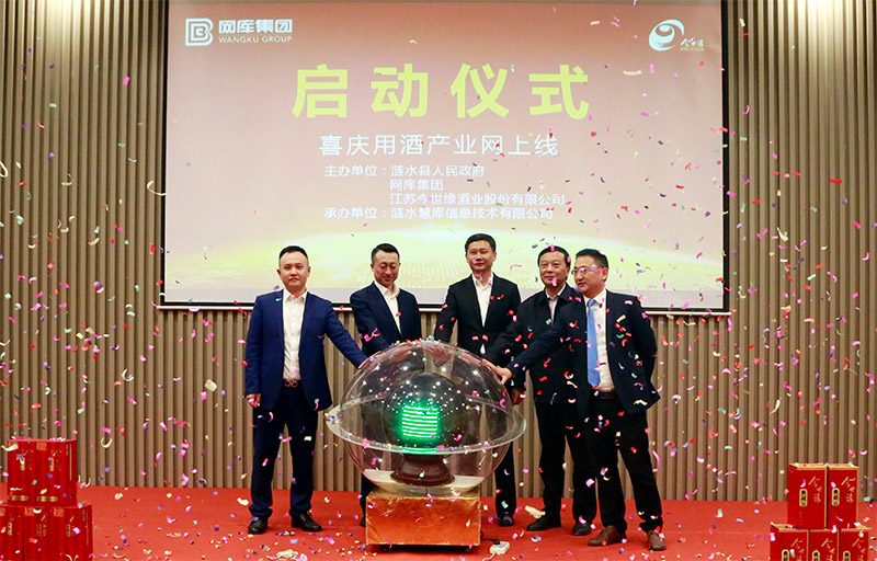 漣水縣委副書記、縣長(zhǎng)時(shí)勇(中),今世緣酒業(yè)黨委書記、董事長(zhǎng)、總經(jīng)理周素明(右二),網(wǎng)庫(kù)集團(tuán)總裁李軍保(左二) 漣水縣副縣長(zhǎng)張亮(右一),網(wǎng)庫(kù)集團(tuán)江蘇大區(qū)總經(jīng)理王亮(左一) 共同為中國(guó)喜慶用酒產(chǎn)業(yè)網(wǎng)上線啟動(dòng)水晶球。