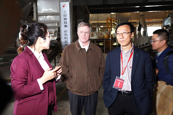 美國俄勒岡州立大學(xué)Michael Qian教授(右二)、美國伊利諾伊大學(xué)食品化學(xué)專家Keith Cadwallader教授(左二)參觀今世緣酒業(yè)智能化示范車間。