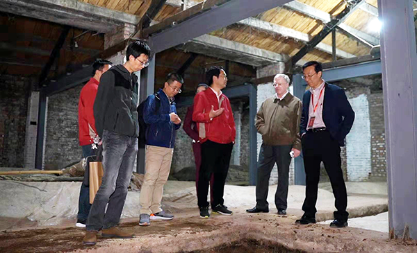美國俄勒岡州立大學(xué)Michael Qian教授(右一)、美國伊利諾伊大學(xué)食品化學(xué)專家Keith Cadwallader教授(右二)參觀今世緣酒業(yè)老窖池。