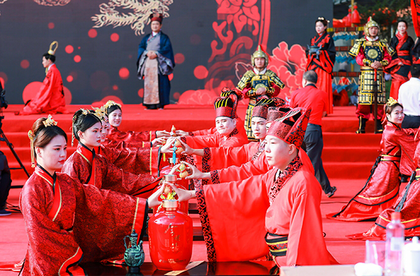 ● 2019年9月19日,來自全國各地的70對新人在今世緣美酒銀行舉行漢式婚典。