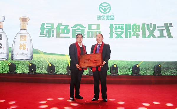 ● 2019年1月9日,江蘇省綠色食品辦公室主任徐繼東(左)向今世緣酒業(yè)副董事長、副總經理吳建峰(右)頒發(fā)“綠色食品”牌匾。