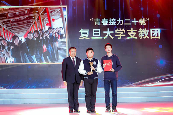 公司黨委副書記、副總經(jīng)理倪從春為“青春接力二十載”的復(fù)旦大學(xué)支教團(tuán)頒獎(jiǎng)。