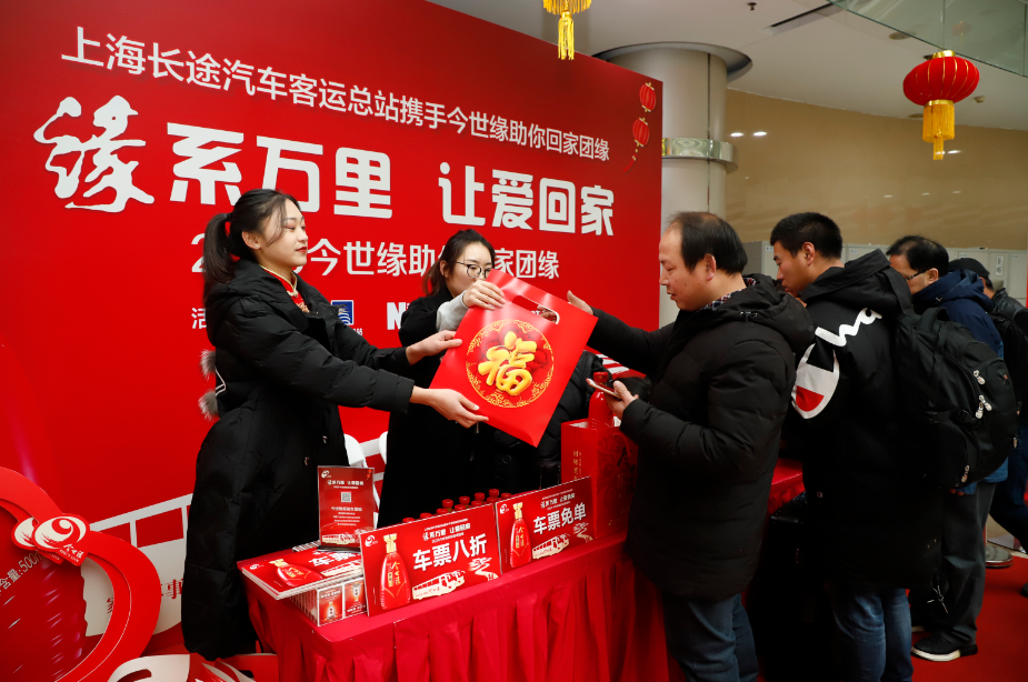 在上海汽車客運(yùn)總站,旅客聚集在今世緣活動(dòng)展臺(tái)前,有的一手拉著行李,一手拎著今世緣贈(zèng)送的新年福袋,臉上透露出開心的笑容;有的拿著現(xiàn)場(chǎng)返現(xiàn)的福利向同伴炫耀著;還有旅客直接獲得了今世緣的美酒,歡歡喜喜帶著它回家過(guò)年……“很意外,這是一份溫暖的禮物,感謝今世緣!”在上海務(wù)工的安徽黃山鄺毅,領(lǐng)到了一張今世緣“五折車票”。