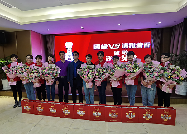 4月17日,鹽城大區(qū)向鹽城市婦幼保健院援鄂歸來的的白衣天使們送上鮮花和今世緣酒業(yè)特別定制美酒國緣V9,致敬逆行英雄。