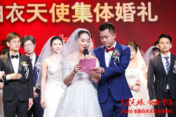 “為白衣天使舉辦婚禮,是一種善緣,更是一種責(zé)任。我們要向懸壺濟(jì)世、醫(yī)者仁心的職業(yè)精神致敬,向迎難而上、舍生忘死的英雄主義致敬,向自強(qiáng)不息、頑強(qiáng)拼搏的民族精神致敬?!蹦邚拇赫f。