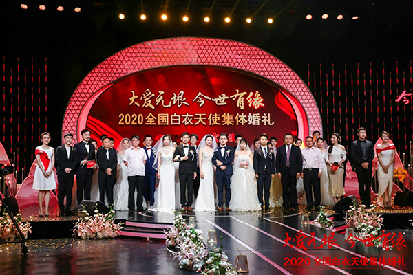 大愛無垠,今世有緣”2020全國白衣天使集體婚禮主辦方領(lǐng)導(dǎo)嘉賓祝福新人。