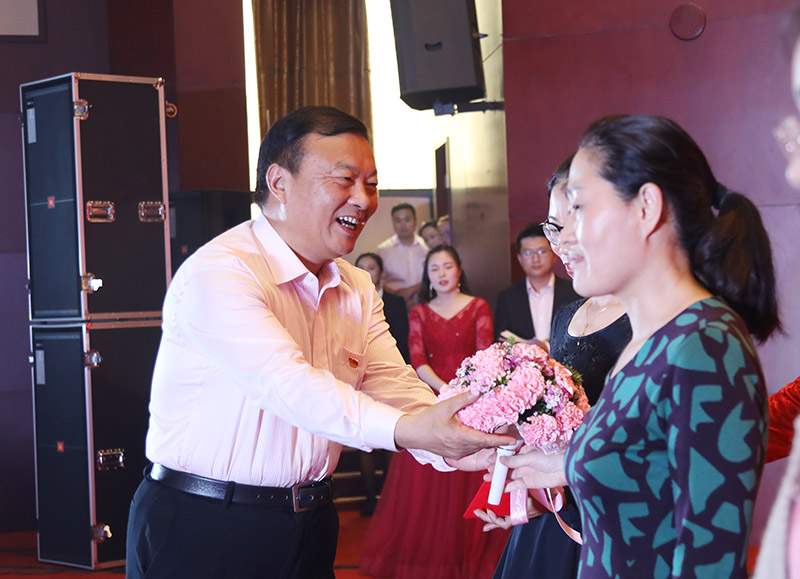 公司黨委書記、董事長、總經(jīng)理周素明在開幕式上為“最美賢內(nèi)助”獲獎代表頒獎