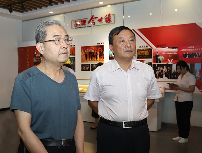 江蘇省人民政府原省長季允石(左)在今世緣酒業(yè)黨委書記、董事長、總經(jīng)理周素明陪同下參觀今世緣展示中心。