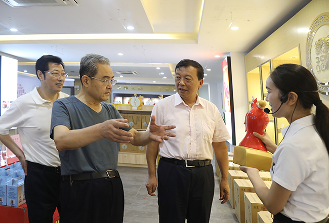 在今世緣南廠區(qū)規(guī)劃圖前,季允石了解美酒銀行二期工程、智能化包裝物流中心、中華緣文化中心的建設(shè)規(guī)劃情況。在美酒銀行文創(chuàng)產(chǎn)品展示區(qū),季允石認(rèn)為把美酒的貯存以“銀行”的方式運(yùn)營,這概念與做法非常好。對今世緣將文化融入產(chǎn)品,產(chǎn)品融入消費(fèi)者生活的理念與舉措表示肯定。“這些酒一般貯存多久?”“都是多少度酒?”在陶壇貯酒庫區(qū),季允石細(xì)致詢問壇裝酒的情況,稱贊今世緣的個(gè)性化定制服務(wù)。