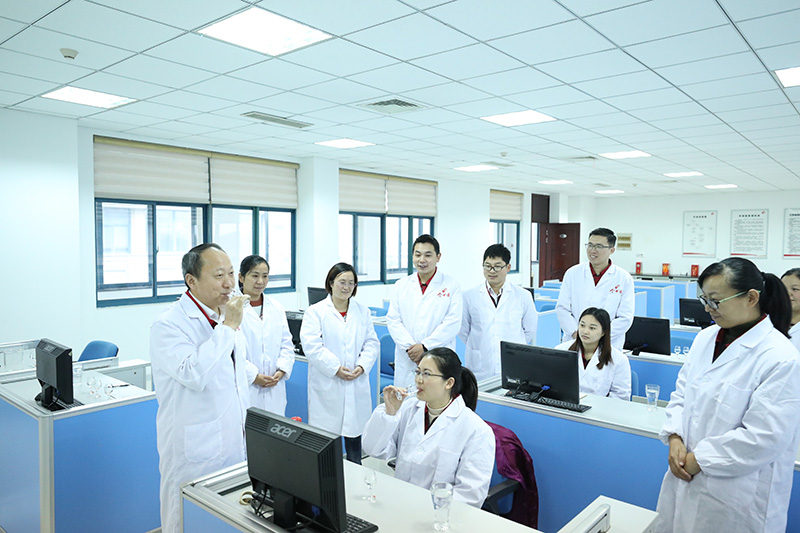 今世緣酒業(yè)副董事長(zhǎng)、副總經(jīng)理吳建峰指導(dǎo)研發(fā)團(tuán)隊(duì)品評(píng)美酒。