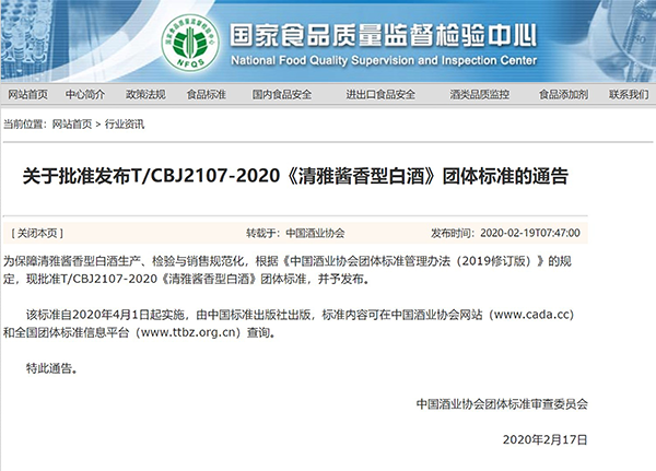 2020年2月17日,《清雅醬香型白酒》團體標準發(fā)布。