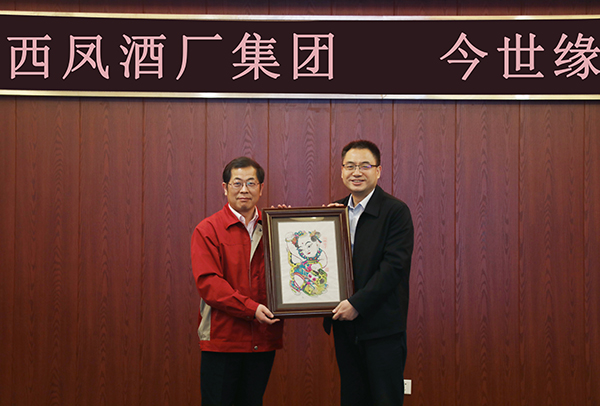 公司黨委副書記、副董事長(zhǎng)、總經(jīng)理顧祥悅(左)與陜西西鳳酒廠集團(tuán)有限公司黨委副書記、總裁楊宏亮代表企業(yè)互贈(zèng)禮物。
