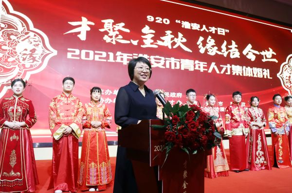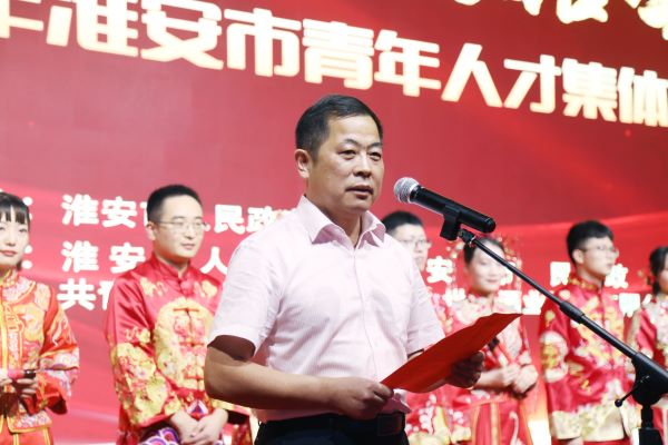 2021淮安市第二屆青年人才集體婚禮由淮安市人民政府主辦,市人才辦、市民政局、團(tuán)市委、今世緣酒業(yè)共同承辦。淮安市民政局黨組書記沈在宏為新人頒發(fā)紀(jì)念婚書。淮安市委組織部副部長(zhǎng)、老干部局局長(zhǎng)、市人才辦主任姜洪洋,共青團(tuán)淮安市委書記何喆共同為新人頒發(fā)愛情信物。