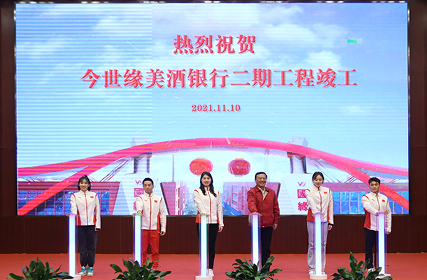 今世緣美酒銀行二期工程存放容積為1立方米的陶壇6.5萬只,2021年10月19日首批原酒開始入庫。二期工程投入使用后,大幅提升了優(yōu)質(zhì)酒的長期貯存能力。張雨霏等江蘇奧運(yùn)健兒和周素明共同見證今世緣美酒銀行二期工程竣工。