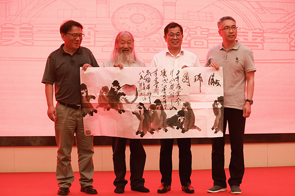 著名畫(huà)家徐培晨(左二)向今世緣贈(zèng)送作品。                蔣更初 攝