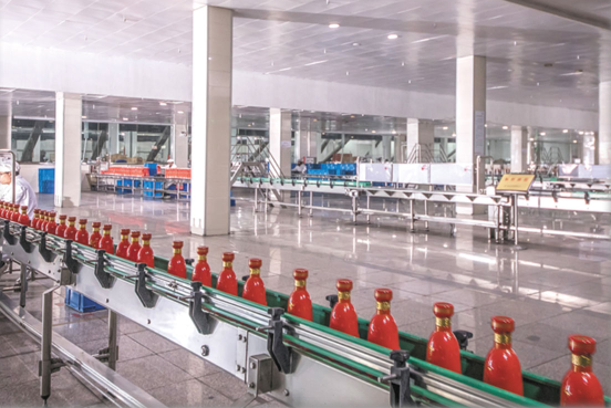 每條生產(chǎn)流水線長171米,分為四個區(qū)域:沖洗區(qū)、灌裝區(qū)、中心檢驗區(qū)及組裝區(qū)。沖洗區(qū)對酒瓶進(jìn)行沖洗,然后進(jìn)入燈檢,檢查瓶身有無破損,外觀有無殘缺,檢驗合格后等待灌裝。灌裝機(jī)將等量的白酒注入到酒瓶里,經(jīng)過壓蓋機(jī)壓蓋后進(jìn)入中心檢驗區(qū)。在檢驗前還設(shè)置了一道烘干區(qū),對瓶身的水漬進(jìn)行烘干。檢驗合格后進(jìn)入組裝區(qū)。