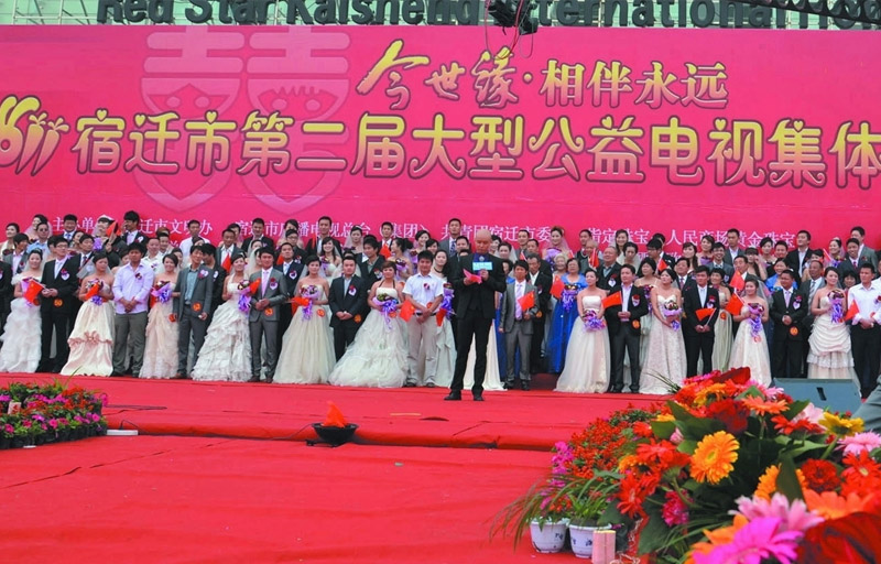 5月1日,30對新人參加了在泗陽舉行的集體婚禮,婚禮現(xiàn)場花團錦簇,彩旗飄揚,洋溢著濃濃的喜慶氛圍。5月2日,宿遷集體婚禮現(xiàn)場。來自各地的90對新人,伴著優(yōu)美的《婚禮進行曲》,微笑著踏上紅地毯,走進婚姻的殿堂。婚禮現(xiàn)場活動由江蘇電視臺《非誠勿擾》欄目組的樂嘉主持。據(jù)悉,婚禮活動的舉辦旨在倡導婚事新辦簡辦和健康文明的社會新風尚,同時慶祝中國共產(chǎn)黨建黨90華誕。