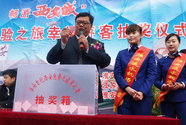 3月20日上午,“喜結(jié)今世緣暢游西安城”淮安—西安首航免費(fèi)雙飛體驗(yàn)之旅幸運(yùn)游客抽獎(jiǎng)儀式在市區(qū)大運(yùn)河文化廣場(chǎng)舉行。副市長(zhǎng)史國(guó)君、市旅游局局長(zhǎng)吉文海、淮安漣水機(jī)場(chǎng)總經(jīng)理張慶明、公司副總經(jīng)理羊棟等出席抽獎(jiǎng)儀式。