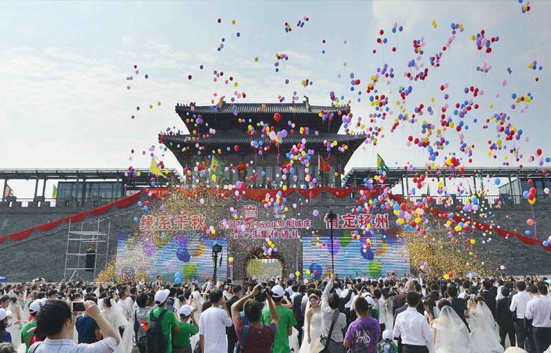 中秋、國慶前夕,以“緣系千秋·情定揚(yáng)州”為主題的“揚(yáng)州2500周年城慶今世緣集體婚禮”在揚(yáng)州瘦西湖畔的宋夾城體育休閑公園盛大舉行,中外2500新人采取現(xiàn)場婚禮和網(wǎng)絡(luò)婚禮相結(jié)合的方式,在2500歲古城的見證下喜結(jié)連理。同步推出的“奔跑吧新人”微信傳播、“我們結(jié)婚啦”網(wǎng)絡(luò)微助力等線上活動也熱鬧非凡,微博閱讀量高達(dá)306萬,新人分享點(diǎn)贊、送花逾200萬人次。